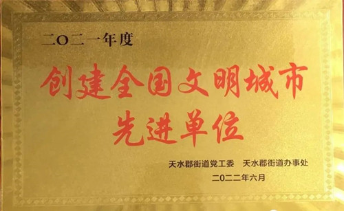 我公司獲得天水郡街道黨工委、天水郡街道辦事處頒發(fā)的2021年度“創(chuàng)建全國文明城市先進(jìn)單位”稱號。